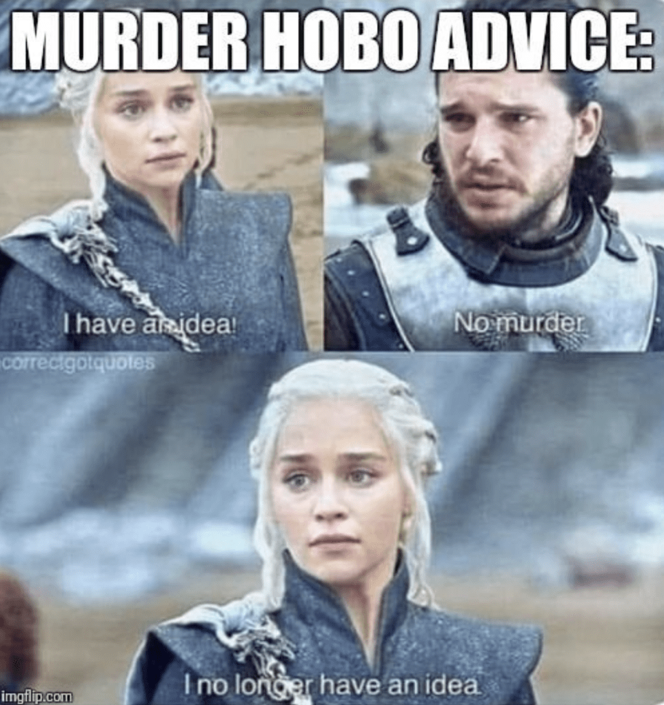 In conclusion, Murder Hobos can be a nuisance and can even bring a swift end to a campaign or even entire friendships if left unchecked, but they are not quite the Boogeyman that the horror stories would have you believe. Understanding the mechanical incentives that lead to these sorts of behaviors is the first step towards knowing how, and when, to correct it.