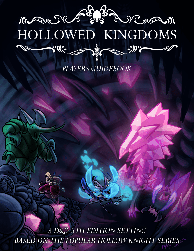 Kara: Hello, my name is Kara, also known as Winona Pike (or Winona). I have been a writer for 15 years and been playing/DMing Dnd 5e games for my friends for the last 10 years. I am also the creator and head writer for Hollowed Kingdoms. My husband, Nick, also known as Darksnowman13, is the lead game designer for the project. The team behind Hollowed Kingdoms is a group of talented friends and Hollow Knight fans. Some who I have commissioned for art, others for writing or editing.