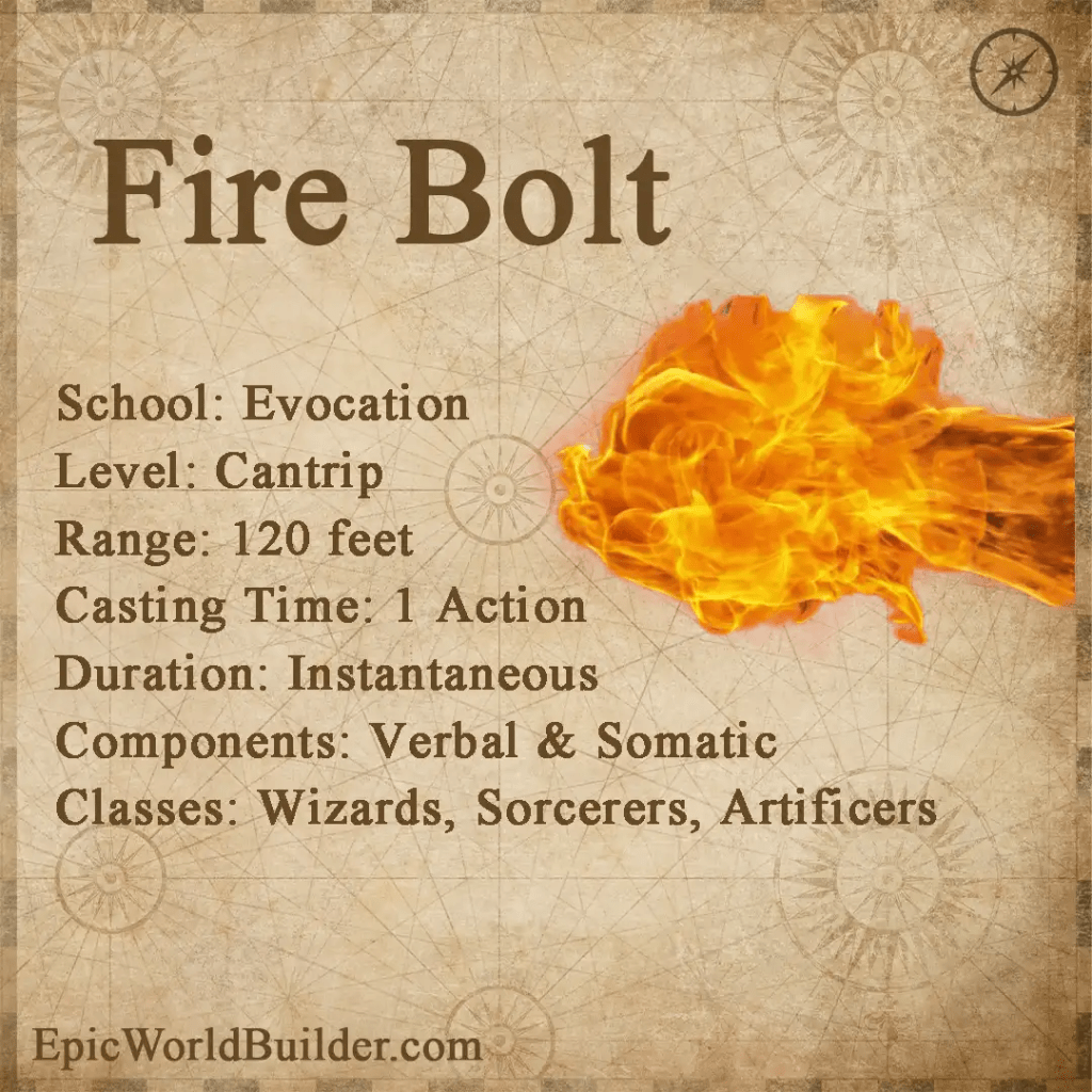 As an example, we will look at the cantrip Firebolt, the 1st level spell Burning Hands, and the 2nd level spell Scorching Ray.
