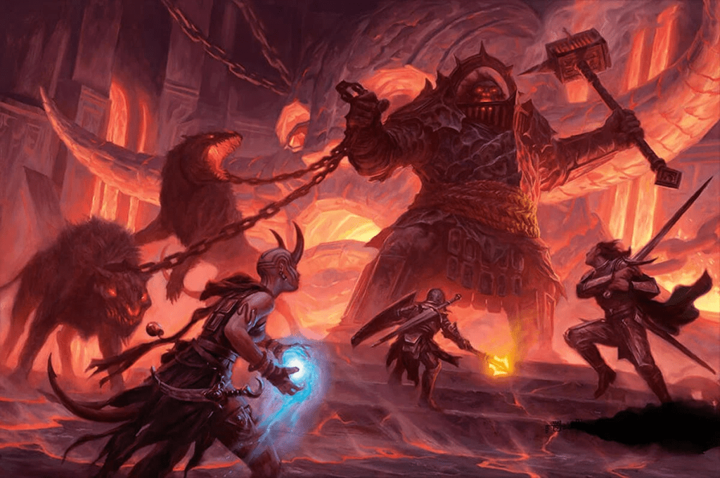 So let’s say our Party of 4 from the above example has the following average damages: PC1: (1D6+3) 7 damage, PC2: (1D8+3) 8 damage, PC3: (1D8+4) 9 damage, PC4: (2D6+3) 10 damage. Their total damage is 34. We want them to hit 40-60% of the time, so 40% of that is 13.6. 60% is 20.4. We want the boss to be a little hard to kill, so let’s give it the AC of 20, so only 40% of the damage gets through. Taking that, you multiply 13.6 (the 40% damage figure) by the number of rounds you want a solo version of this Boss to survive. Say you want it to last 5 rounds, so the Boss would need 13.6 multiplied by 5 rounds, or 68 HP. If you include minions in the fight, you will have to take them into account in the same way. Say 3 Minions of AC 16, getting hit 60% of the time, and is taking 20.4 average damage from the whole party. 20 HP for each minion would add 3 rounds to the fight, since damage from all members of the party would knock out one minion per round. In total, this Midline encounter would now last 8 rounds with a Boss NPC of AC 20 (HP 68) and 3 minions of AC 16 (HP 20).